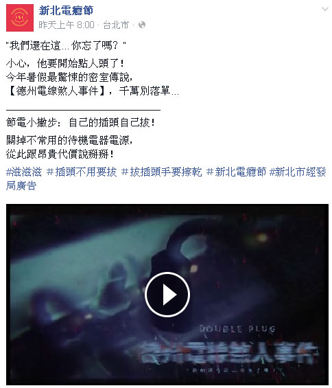 广告执行:政府宣传节电,巴拉巴拉一大堆,但民众未必就照做。因此为了吸引大家关注节电,同时配合鬼月。新北市政府推出了一个恐怖片节电项目:新北电瘾节。
