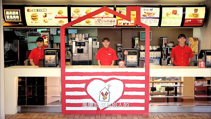 台湾麦当劳营销活动 爱心不找零柜台 2015-12-02 麦当劳都有设置爱心捐款箱,但是有很多人并没有注意到捐款箱的存在,于是台湾麦当劳就把爱心捐款箱扩大,变成一个爱心不找零柜台。 爱心不找零柜台让更多人知道,可以把零钱捐出来帮助更多的小朋友