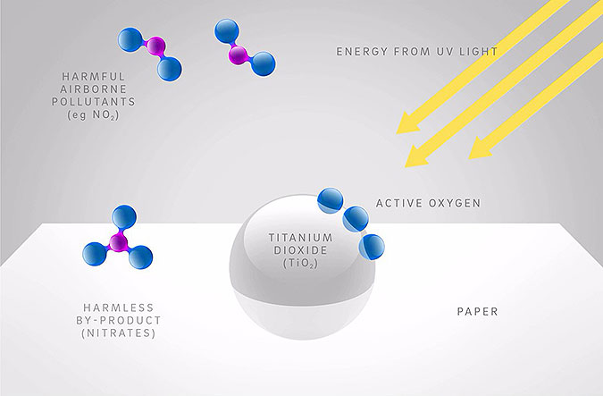 为了突出E.ON对改善空气质量的承诺,官方制作了一份与众不同的 "白皮书",这是世界上第一份吃污染的文件。白皮书是在一种特殊的纸浆上印刷的,纸浆中含有二氧化钛,一种具有光催化特性的化合物。由一家碳中和造纸厂开发,当它与光结合时,会与空气中的污染物(如氮氧化物)发生反应,将其分解成无害的副产品(硝酸盐)。二氧化钛吃污染的特性早已为人所知,这种纯白色的粉末已被混入油漆中,制成有助于减少污染的涂料,还被混入混凝土中,使建筑物的结构对其周围城市的空气质量产生积极影响。