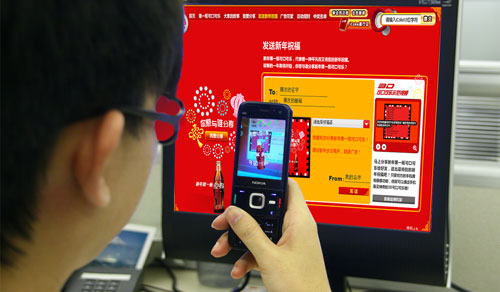 除了使用在年节时最广为应用的短信拜年,向iCoke会员发出 "新年第一瓶可口可乐" 新年祝福短信,同时也在iCoke平台上提供国内首次应用的全新手机交互体验,让拥有智能手机的使用者,通过手机增强现实技术(AR Code: Augmented Reality Code) 的科技,用户收到电子贺卡时,只要将手机的摄像头对准荧幕上的贺卡,就能看见一瓶三维立体的可口可乐于环绕的 "新年第一瓶可口可乐,我想与你分享" 的动态画面浮现在手机屏幕上,并伴随着活动主题音乐,.新技术的大胆运用给年轻消费者与众不同的超前品牌体验。