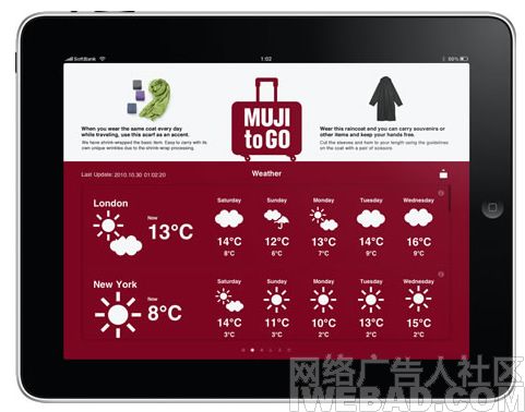 rGZ中国网络广告人学习交流社区 rGZ中国网络广告人学习交流社区 Muji(无印良品)推出iPad应用《Muji to go》(App下载地址)rGZ中国网络广告人学习交流社区 在这个应用上面,用户可以进行简单的天气查询,计算,货币换算等等操作。rGZ中国网络广告人学习交流社区