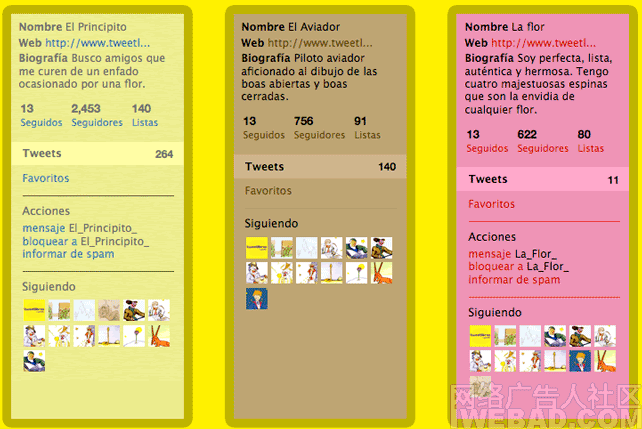 广告执行:借助微博平台,根据书中的人物,创建多个人物账户。在此案例中,把《小王子》(作家安东尼·德·圣-埃克苏佩里于1942写成的著名法国儿童文学短篇小说) 里面的13个人物(下面图例)都创建一个twitter账户,这13个人根据书中的描述,按照一定的顺序进行故事。而(根据Twitter的评论特点)用户想看完整的书籍,就必须都跟随了这13个人。