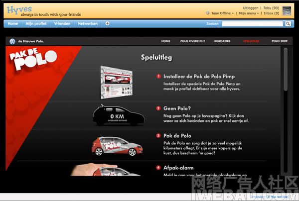 2、然后在社交网站Hyves.nl上面制作了一款有点游戏味道的互动广告,和现实生活在中的道理一样,谁把汽车抢到(自己的个人主页),汽车在主页上呆的时间最长,那么谁就能获得一定的奖品;