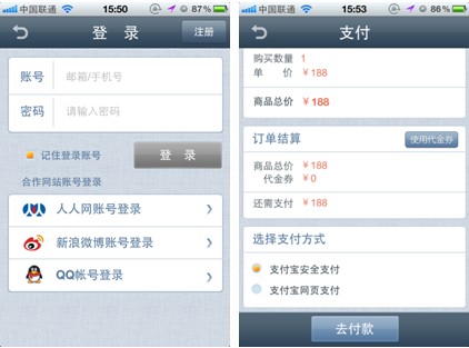新版本的另一个亮点则是新增了支付宝快捷支付功能,消费者在确认订单后,可直接跳转到支付宝手机客户端(需在手机上安装支付宝手机客户端)完成整个支付环节,大大提升了用户体验,降低了支付风险。据悉,目前绝大多数团购网站的移动客户端都还仅支持跳转到支付宝wap页面进行支付。