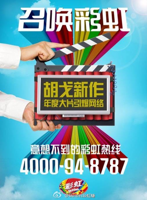 胡戈新作品,为彩虹糖skittles做的恶搞短片《油田引发认亲案》,用户拨打彩虹热线4000948787还真的可以听一些搞笑好玩的东西,头一次看到企业申请400电话为广告做宣传,赞。
