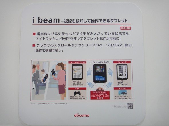 日本 NTT Docomo 设计了一个iBeam界面,透过两个置于平板底部摄像镜头,追踪眼球动态,用户眼球看哪里平板的指针就会到哪里,然后用户只需要点击屏幕上“眼睛选中”的地方就可以了,协助用户更快的完成输入。