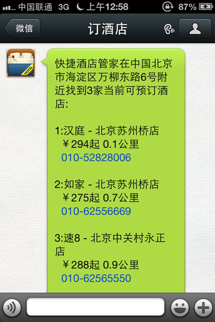 我们知道目前有几家公司已经通过这个接口实现了比较高级的功能,比如“订酒店”这个帐号。当用户在微信中把自己当前的地理位置(微信可以直接发送地图信息)发送给订酒店之后,订酒店会回复一条信息,告诉用户附近有哪些酒店可以预订,并提供订房的费用和电话号码(目前不支持直接付费)。