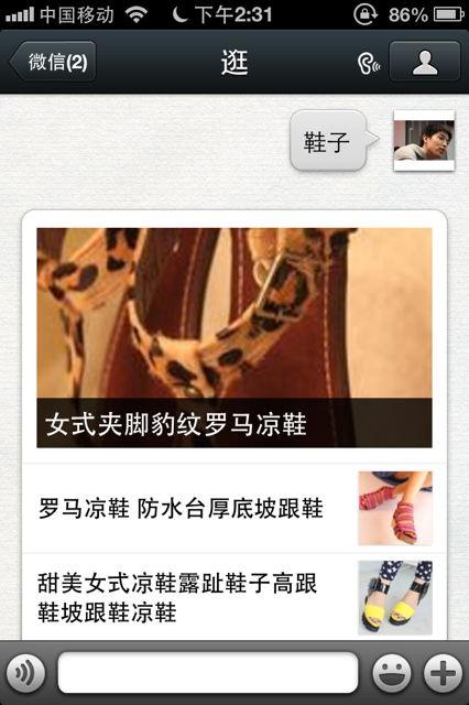 第二个例子是白鸦做的“逛”,用户向逛的帐号发送“鞋子”等商品信息,逛会自动回复三条图文并茂的鞋子信息给用户,点击可直接进入逛的移动版页面。