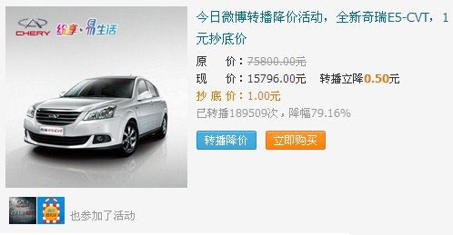 3月15日零点,奇瑞E5在腾讯微卖场平台推出了“奇瑞E5‘转’回家”网络活动。这个结合了微博与电商的新型互动营销玩法,一上线便获得了广大网友的热情参与,截至到23日17点,原价7万5千8的奇瑞E5优悦型CVT,经过21万多次的踊跃微博转播,被一网友以15800的点亮价成功转播买走一台汽车。而汽车最后的价格已经被转发降价到市场原价的20%!在短短5天内,吸引超过12万名网友疯狂的参与其中。