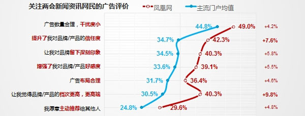根据数据显示,2014年两会期间,凤凰网两会用户的关注度,最常使用率均高于主流门户网站均值。尤其是最常使用率,凤凰新闻资讯,凤凰视频和凤凰财经两会报道最常使用率均排在同类网站首位。两会用户满意度高达96.8%,明显高于主流门户均值。凤凰网被称为“两会首选门户媒体”可谓是实至名归。