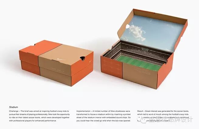 单单从外观上看,这是一个普通的鞋盒。然而,打开盒子,发现原来别有洞天。蓝蓝的天空,绿油油的草地,密密麻麻的观众席,勾画出一个足球场,配上产品——运动鞋,简直就是视觉的冲击。
