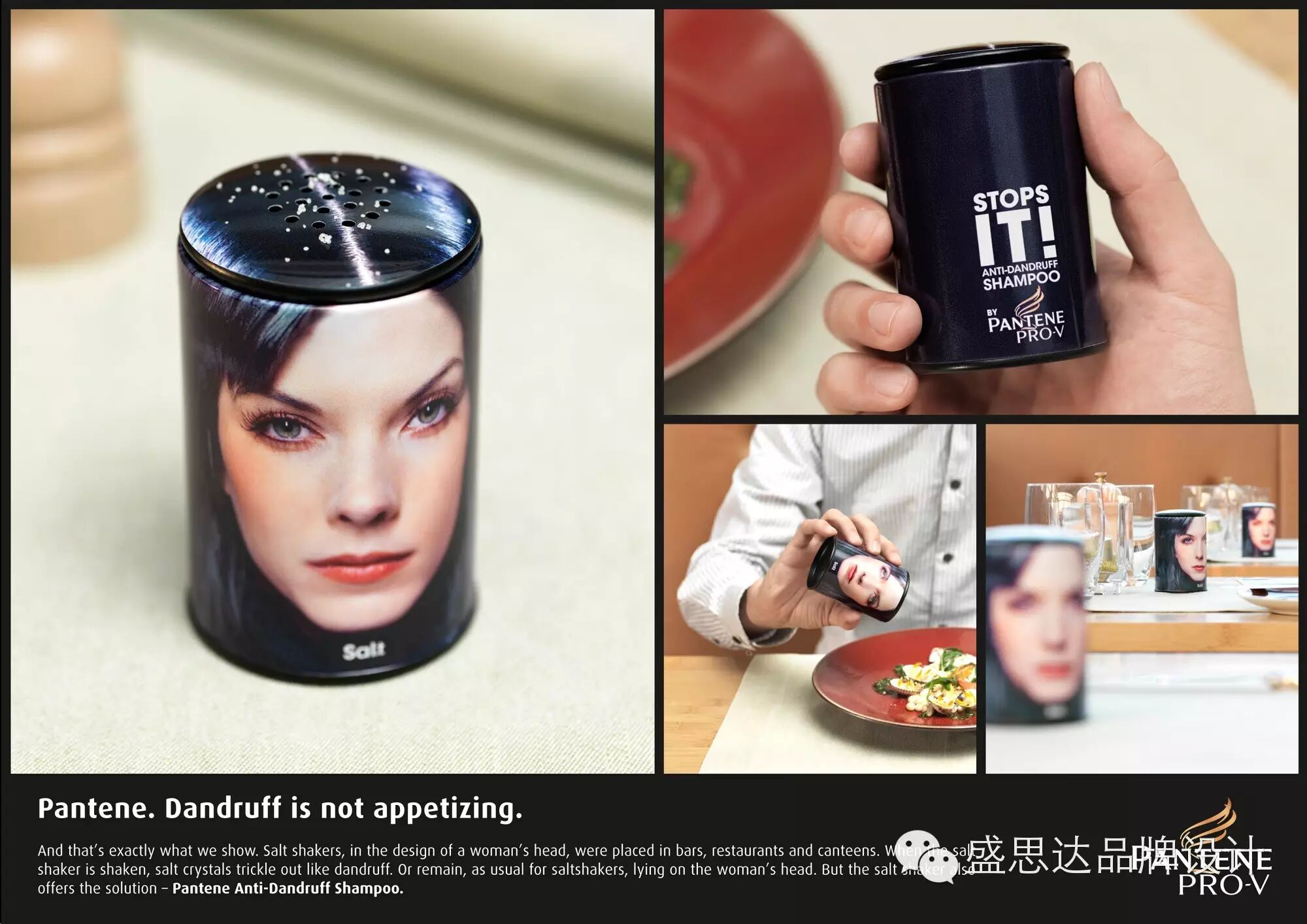 这是一个盐罐,也是一个洗发水的广告。把人的头部印刷在盐罐上,残留的白色盐粒在黑色的瓶罐上显得格外突出,就像是头皮屑一样,此情此景,让人大倒胃口。然而,只要稍微旋转一下瓶身,就会看到这么一句话:不想这样,就用我的洗发水吧。